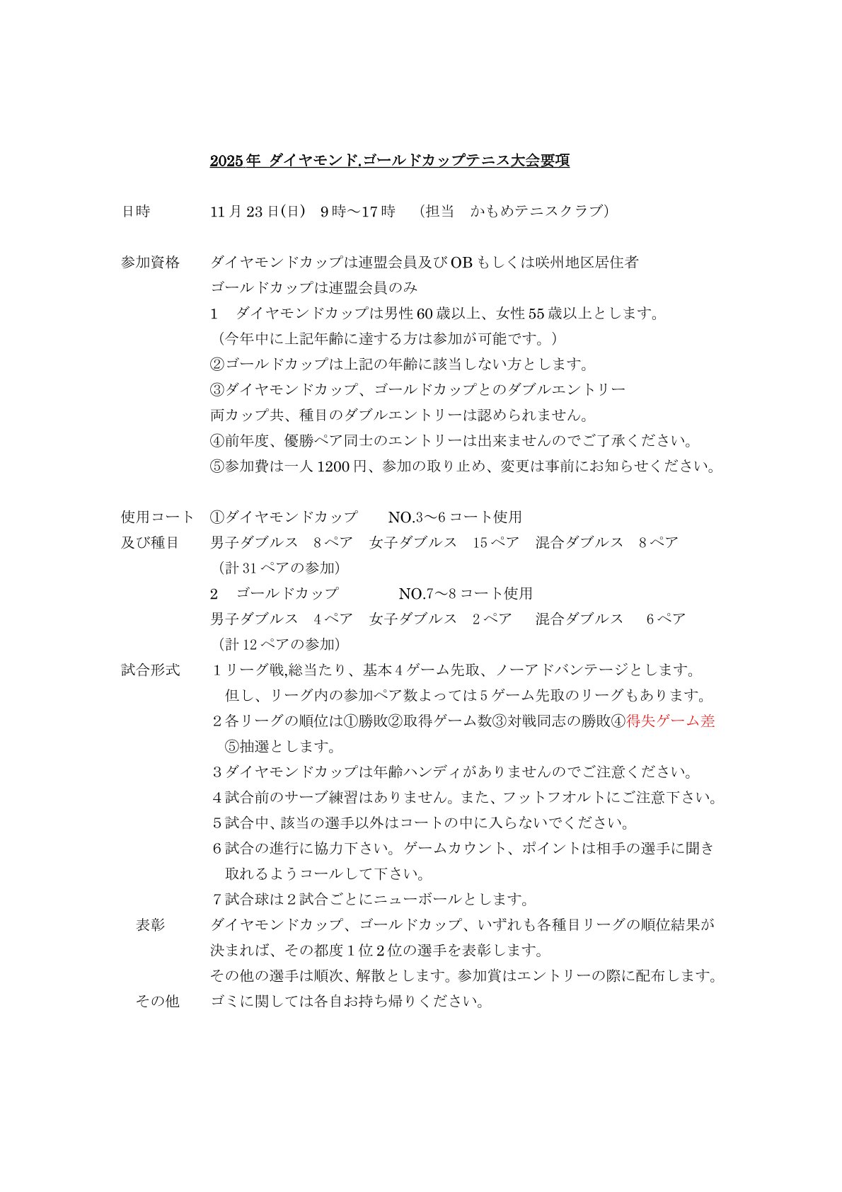 2025年11月17日 / 最終更新日時 : 2025年11月17日 nanko 未分類 2025年 ダイヤモンド、ゴールドカップテニス大会 コメントを残す コメントをキャンセルメールアドレスが公開されることはありません。 ※ が付いている欄は必須項目ですコメント ※ 名前 ※ メール ※ サイト 次回のコメントで使用するためブラウザーに自分の名前、メールアドレス、サイトを保存する。